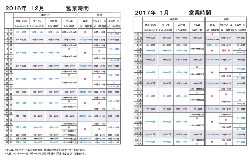 2016年12月と2017年1月の営業時間ご案内(冬季営業)