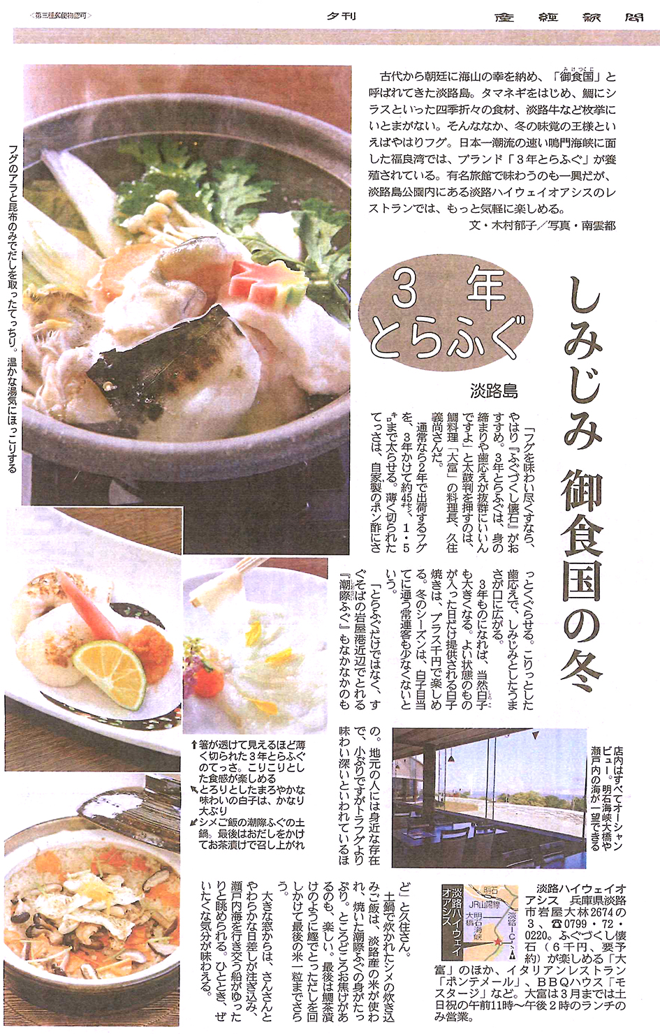 産経新聞(2016年11月30日)夕刊にて淡路ハイウェイオアシス「大富」の3年とらふぐメニューが紹介されました。