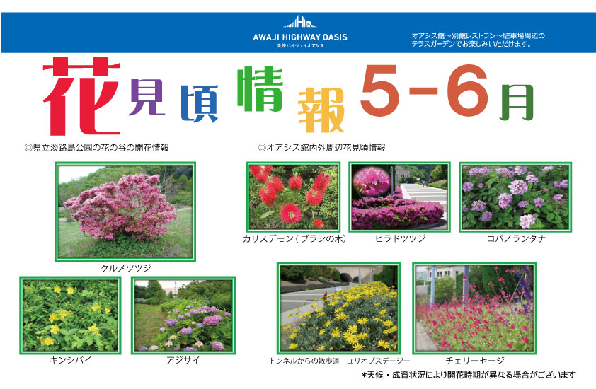 淡路ハイウェイオアシス及び淡路島公園-花の谷の見頃の花情報(5~6月)です。