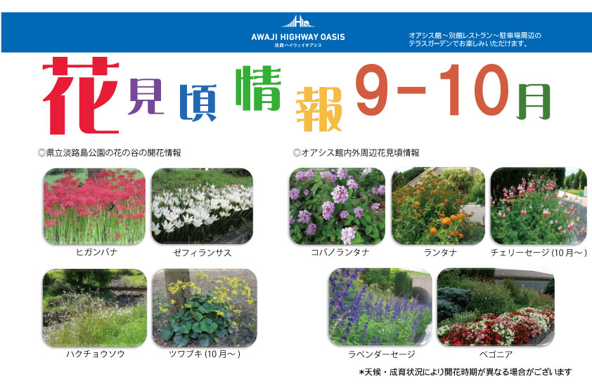 淡路ハイウェイオアシス及び淡路島公園-花の谷の見頃の花情報(9~10月)です。
