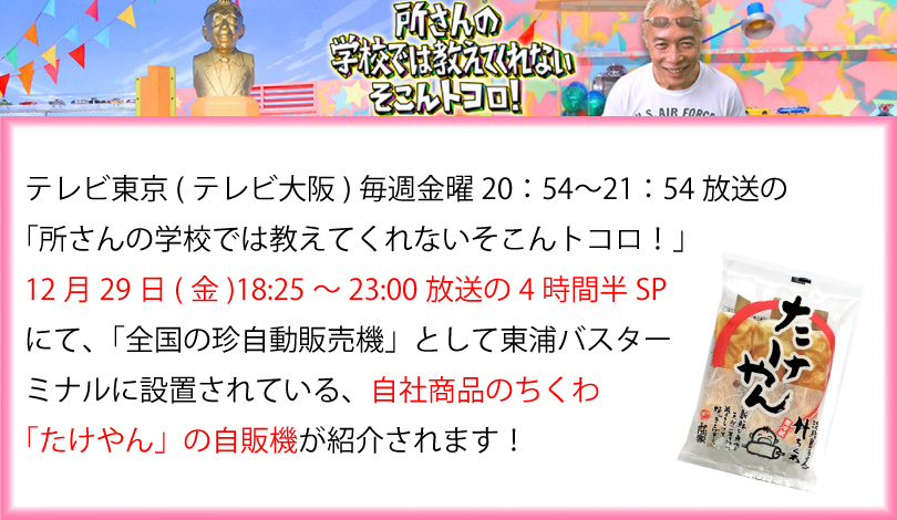テレビ東京(テレビ大阪)「所さんの学校では教えてくれないそこんトコロ!」にて自社商品「たけやん」の自販機が紹介されます。