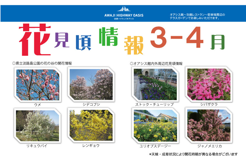 淡路ハイウェイオアシス及び淡路島公園-花の谷の見頃の花情報(3~4月)です。